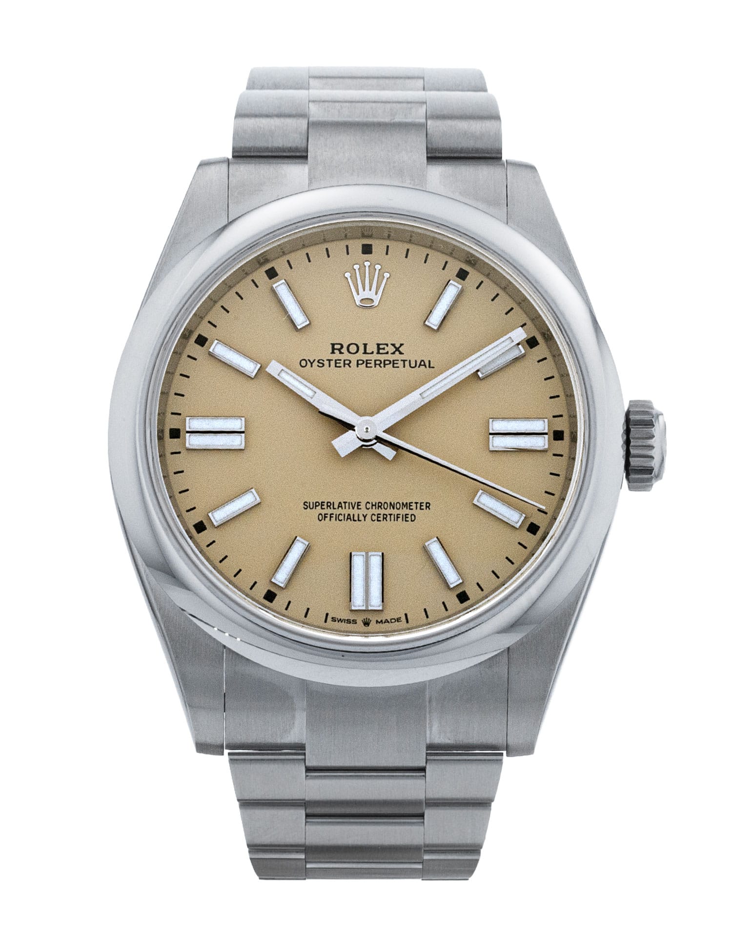 This Rolex Oyster Perpetual 41 134300 has a beige dial and a bracelet strap. This Rolex has undergone a thorough inspection of water resistance, accuracy, functionality and condition to determine the level of reconditioning required to meet our strict standards. It has also been referenced against technical documents and manufacturer records where available to ensure authenticity and a clean history. Our watches have a 24-month warranty for your peace of mind, in conjunction with any remaining manufacturer’s warranty from new or from service. To maintain the manufacturer’s warranty on this watch, it has not been polished in our service centre.